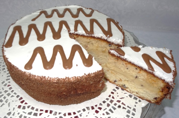 Торт "Белый мрамор" | Медовые коржи прослоены сливочным заварным кремом . Торт заглазирован шоколадной глазурью. | 1000г. |