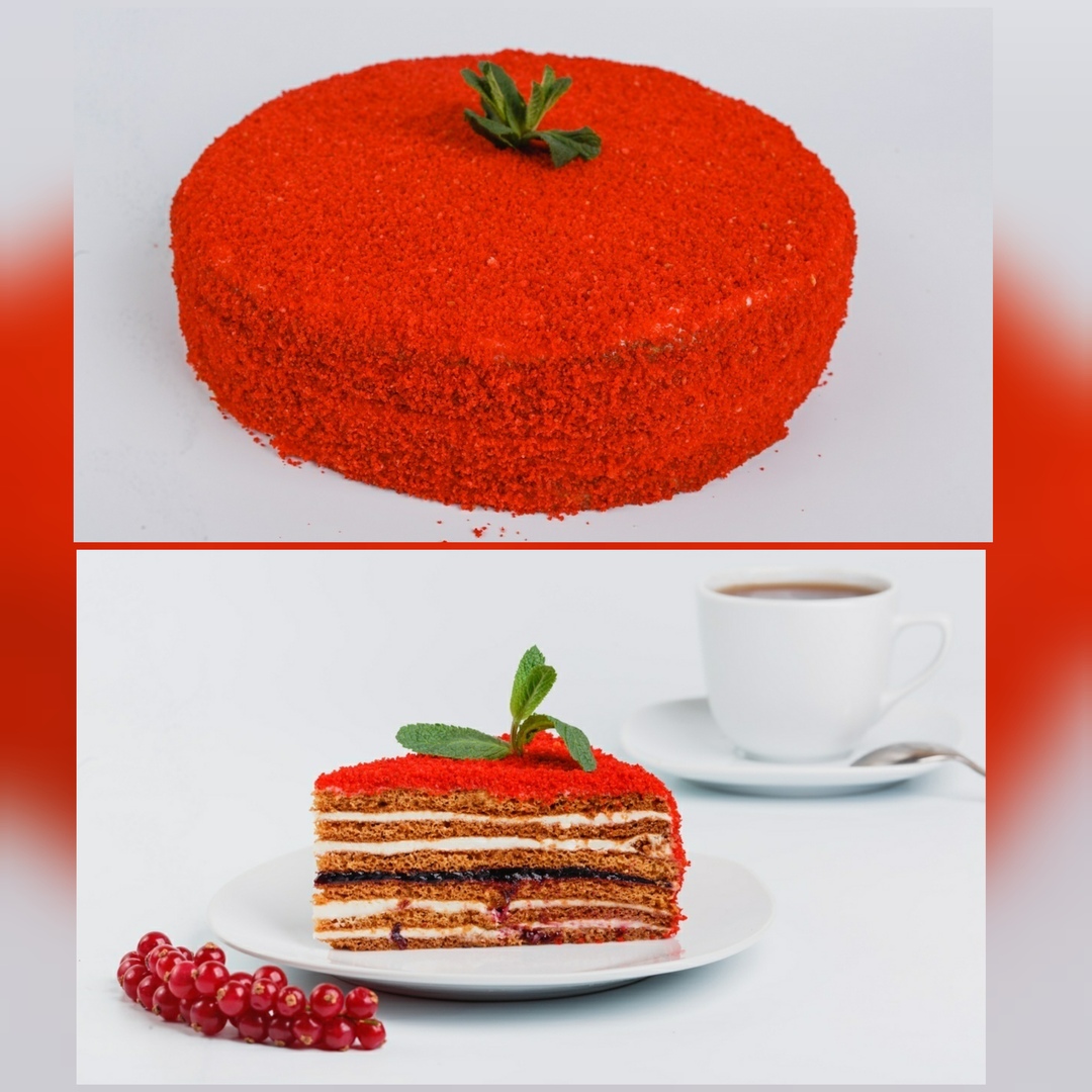 Торт "Красный бархат" | Медовые коржи прослоены нежным сметанным кремом в сочетании с джемом из черной смородины, придающим пикантную кислинку. Оформлен яркой бисквитной крошкой. Продается, так же, кусочками на вес. | 1600г. |